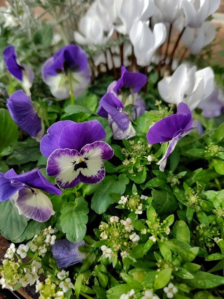 パンジーと💜アリッサム🤍白いシクラメン💚