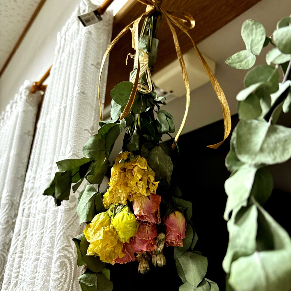 娘達に貰った花束を💐なが〜く残したいのでドライフラワーにしてみました 逆さにして2週間経過した所です 良い感じ〜 初めて作りましたと言ってもブラ下げているだけなんですがね💐