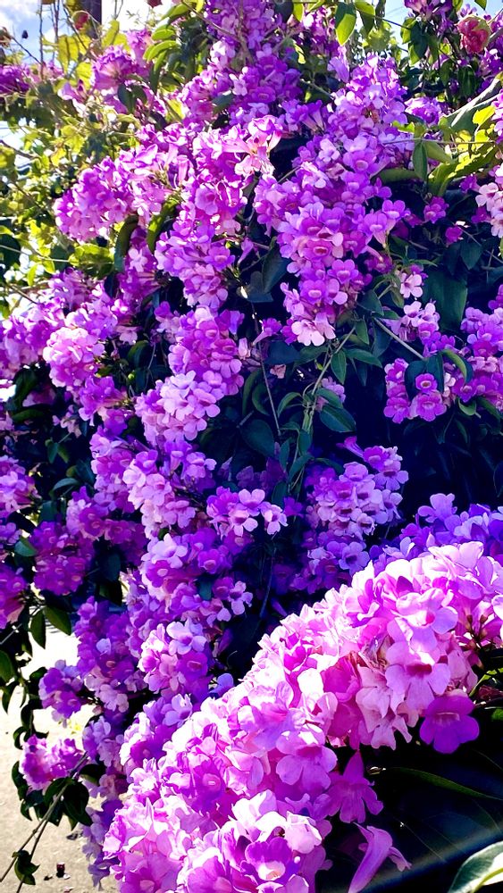 昨日は母の介護で実家に泊まりでした!向かいの叔母宅のブロック塀を覆い尽くす様にニンニクカズラが満開していました💕🌿💜🌿💜🌿