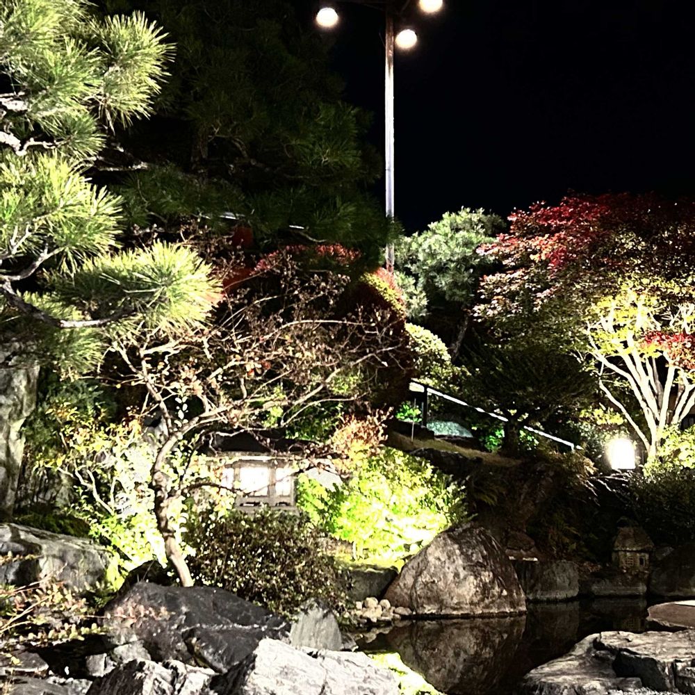 5️⃣泊まったお宿にて足湯に入りながら見た、紅葉したお庭のライトアップ🍁
