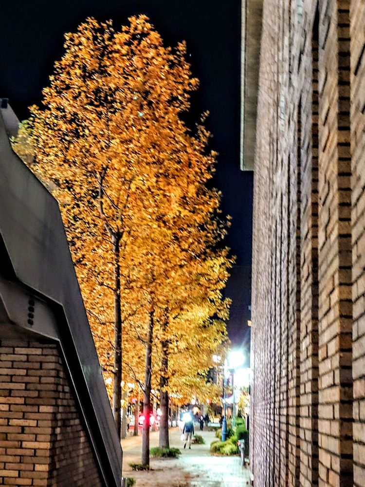 ホール横のイチョウの街路樹も色づいて