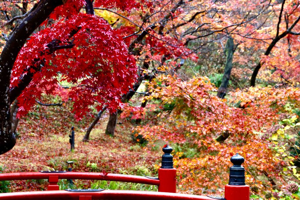 新潟県西蒲原郡にある弥彦公園のトンネルをくぐるとお目見えするもみじ谷。もみじ谷にかかる赤い美しい橋「観月橋」。