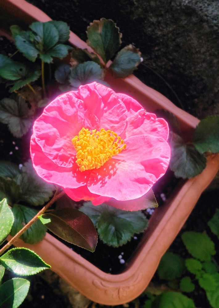 ①②夢見る山茶花🩷(下の葉は🍓です)