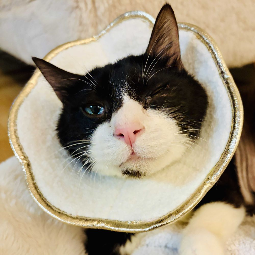 写真のエリザベスカラーだと、自分で外してしまったり、眼に足が届いてしまっていたようで、中々治らず長引いてしまってます😅。