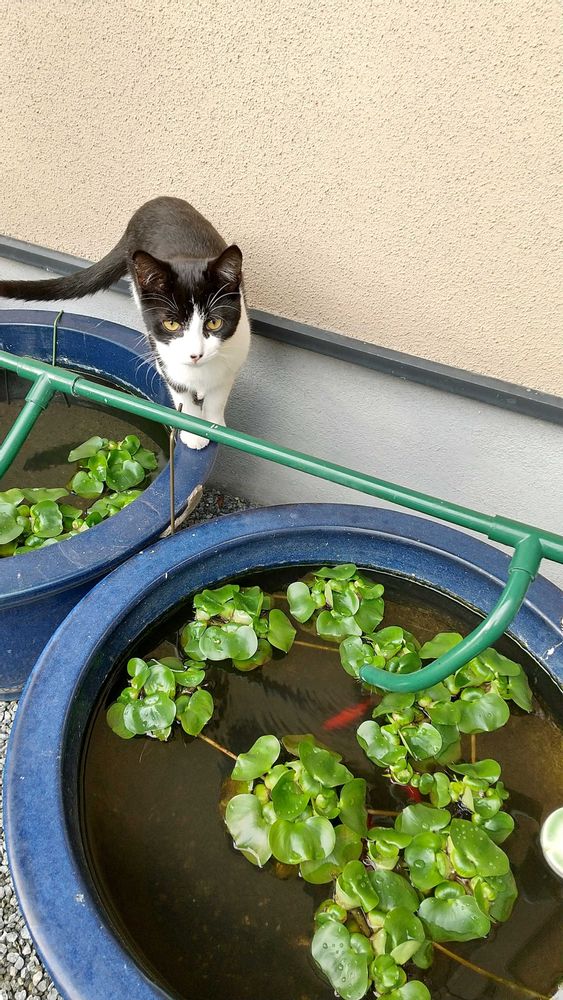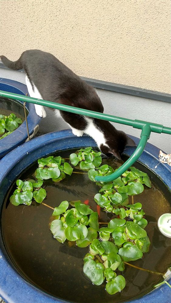 金魚鉢のホテイアオイとお隣のネコちゃん🍀