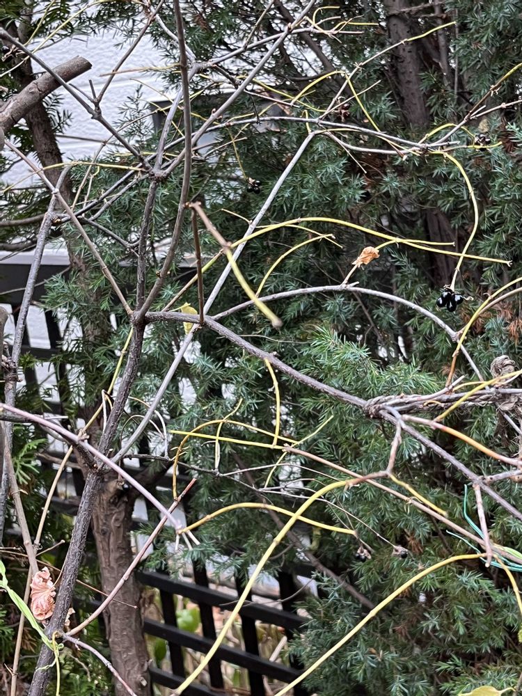 午後から雪がチラついて寒い庭でシロヤマブキが黒い実を付けてました