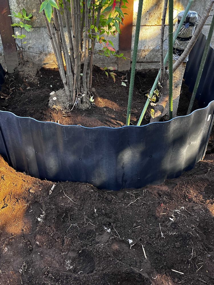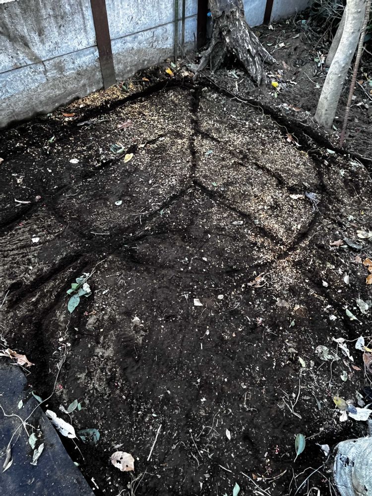 風で運ばれて来た土が積もって坂になってしまった敷地境界線付近、平らに是正するのは正直言ってキツイ。