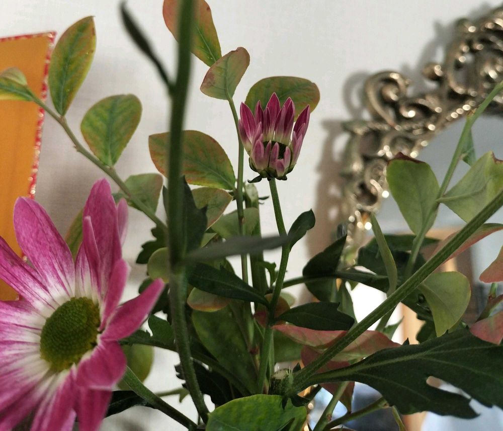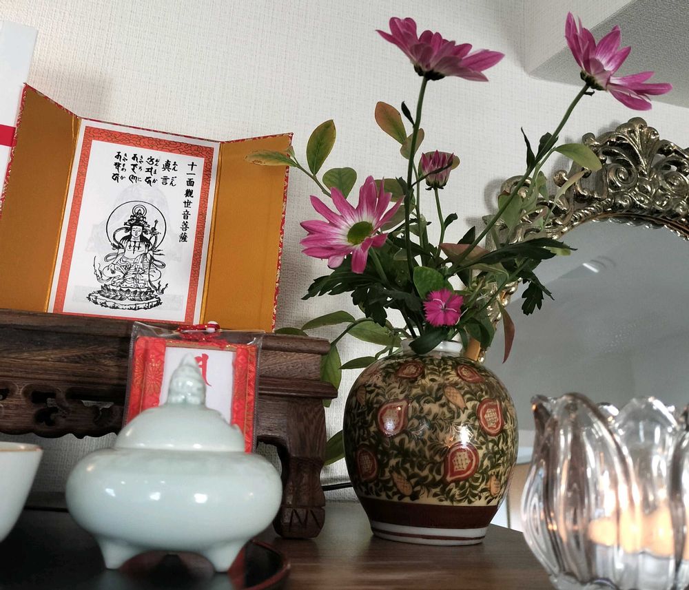 丁度、仏様の仏花が菊だけで寂しく、個人的にシキミが今一つ好きでないので、不謹慎に当たるかも分かりませんが、このブルーベリーあしらっちゃいました😚💞ちょっぴり紅葉気味で、ヤバイ可愛すぎるっ🤩✨と、一人でテンション 爆上がりしてました💦スィマセン