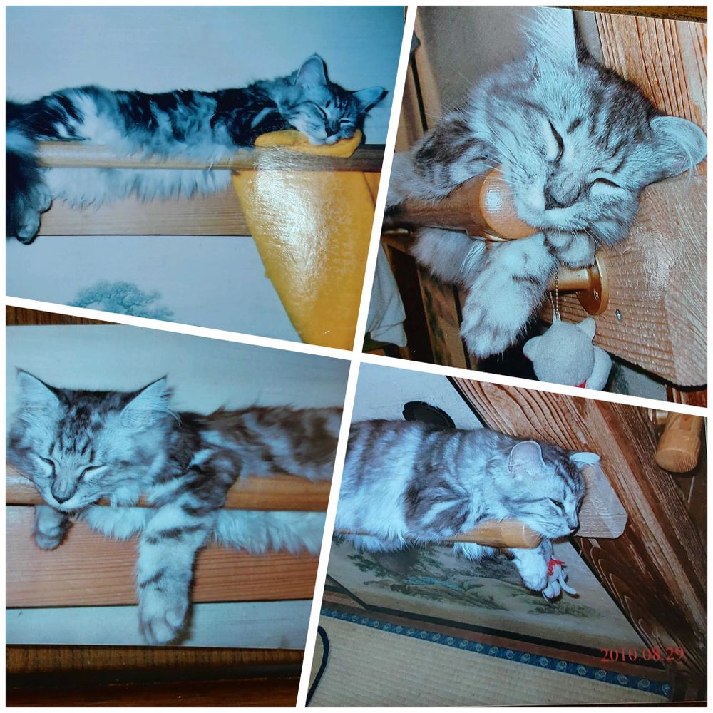 祖母と同居していた時、介護用に付けた手摺りに、登って寝てたモコです。まだ幼い時もこもこ感は、無かったかも・・