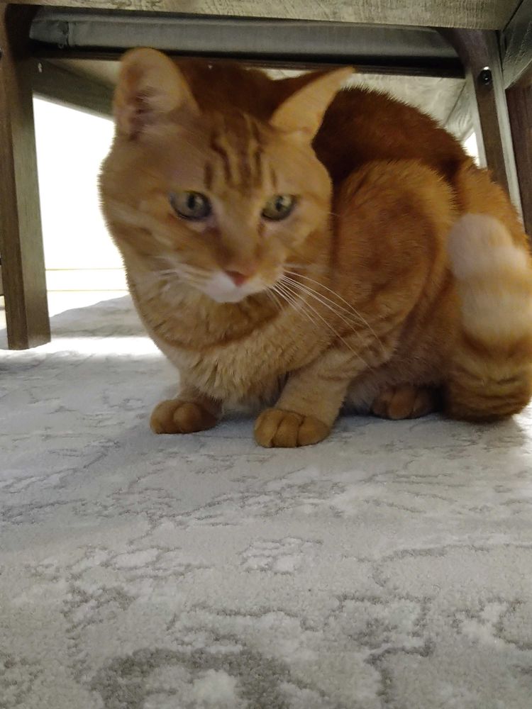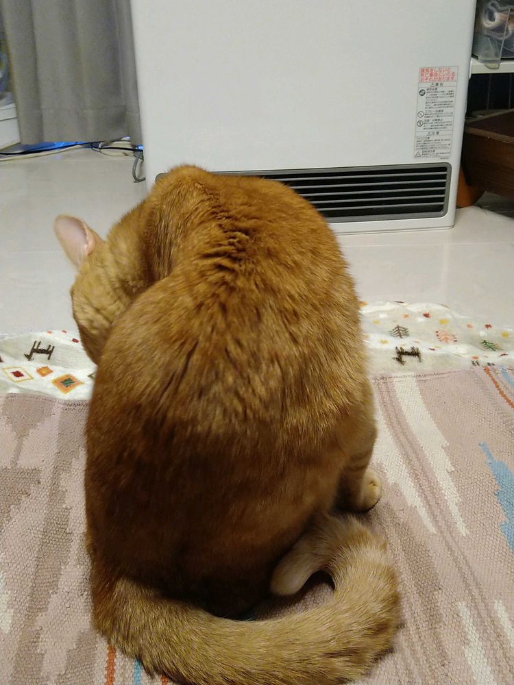 ファンヒーターを付けても、気温が高くあったかい風が出てこないので椅子下で待機してるとらちゃん♂