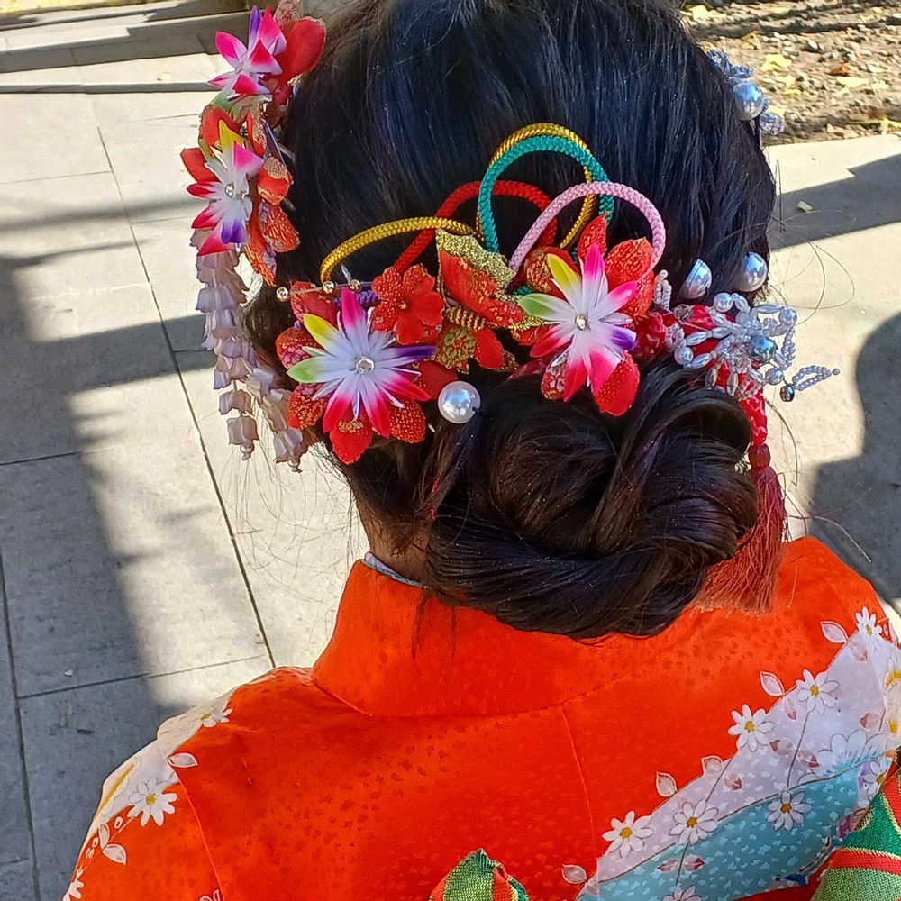 髪型が少し大人っぽく仕上げて、真っ赤な着物と合っていますね👘