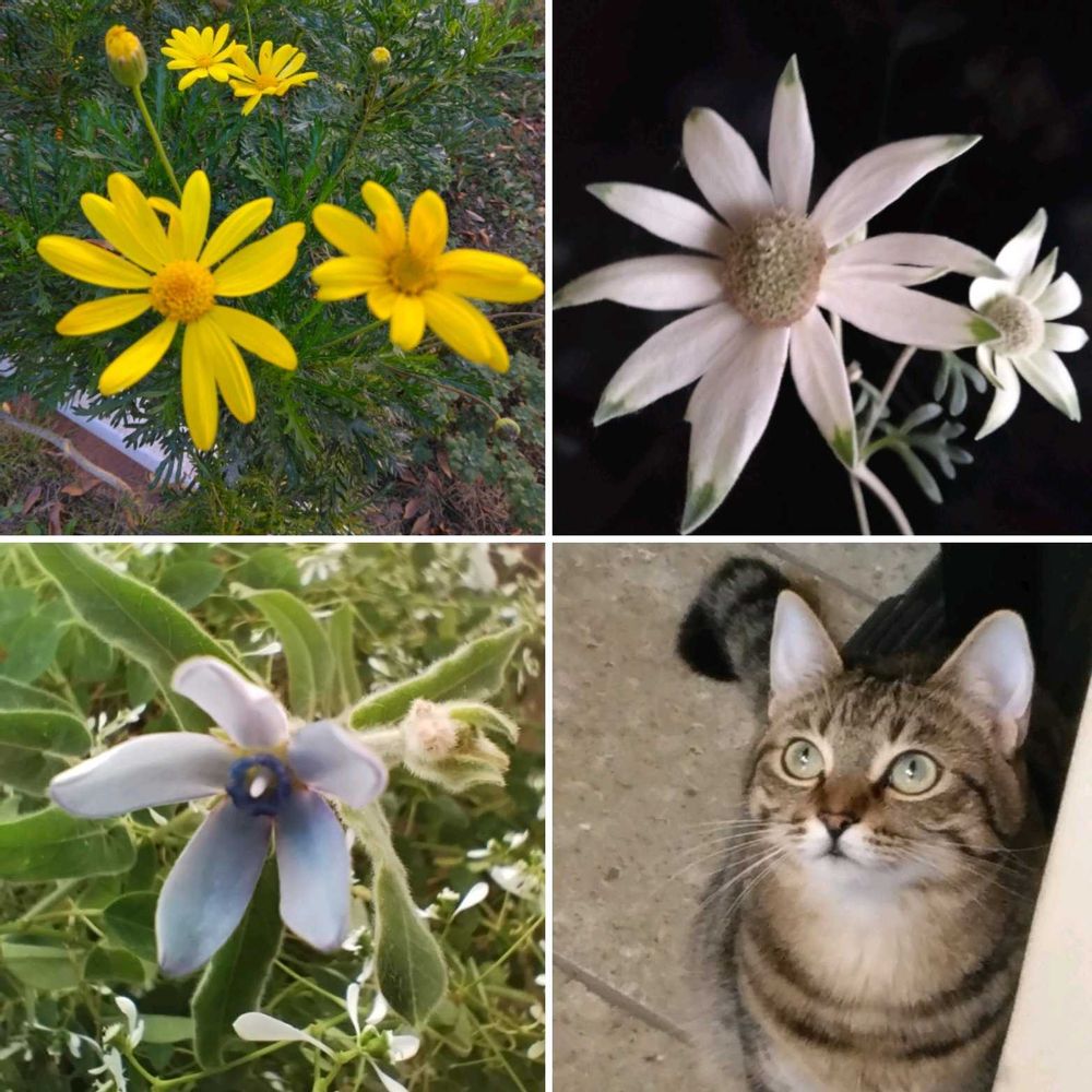 今日の花、ユリオプスデージー、フランネルフラワー、あられ😺、ブルースター(今頃咲きました。種は無理でしょうね😅)