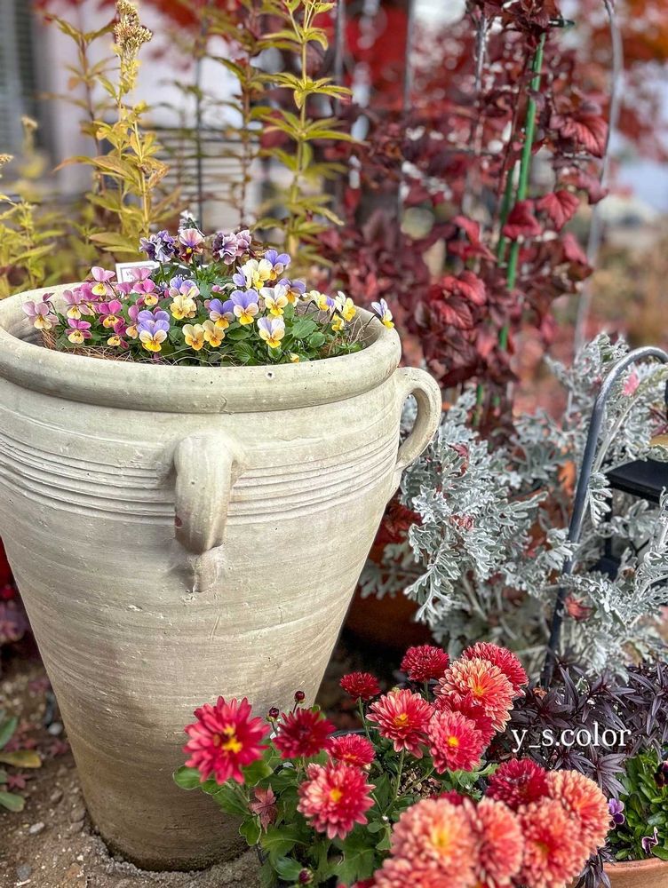 背の高い鉢にビオラの寄せ植えです💛