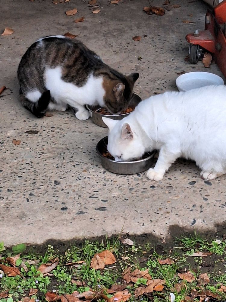 黒が入っている方の野良にゃんはまだ子供ですがエサの時だけ来ますが、あとはおいでと言ってもなかなか近づいてきません(笑)
