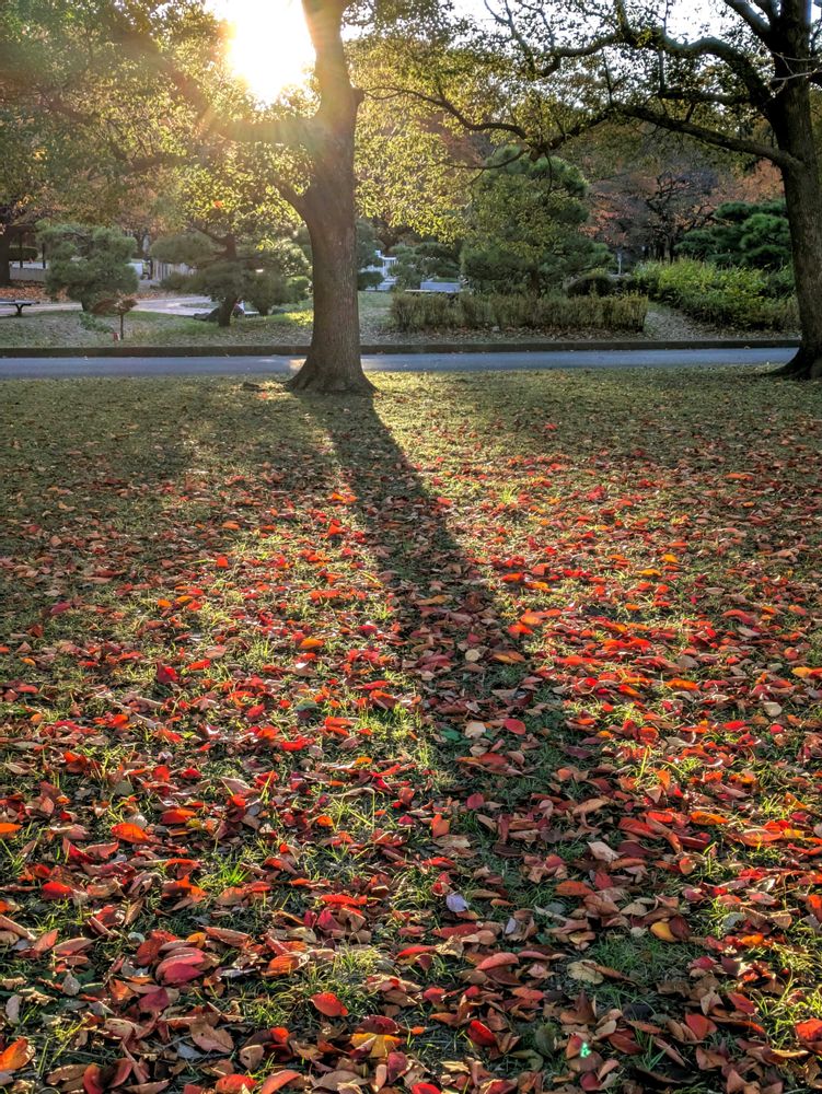 長く伸びた木の影と落ち葉、光のコントラストが見事です✨