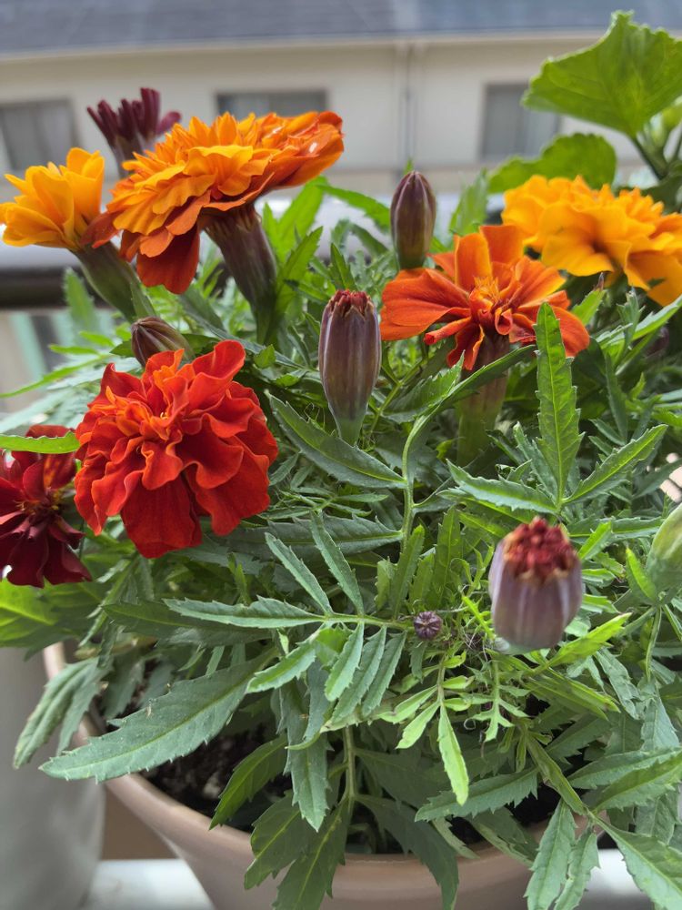 先月、お花屋さんで、秋色のマリーゴールドの入荷仕立ての苗に出会えたので、マリーゴールドは夏の花と思いましたが、とても気に入って、