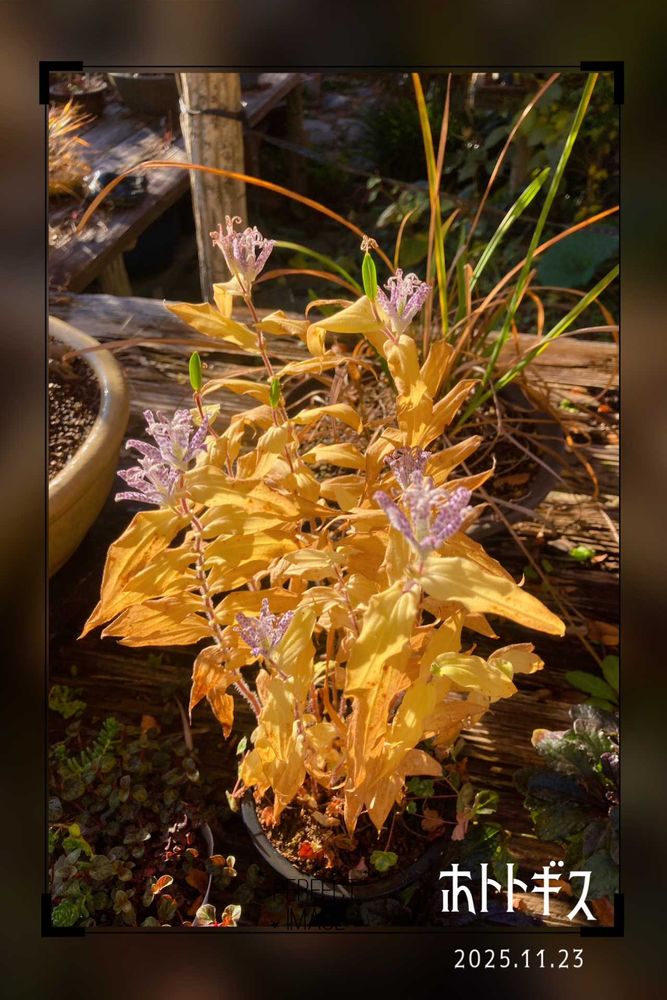 葉が真っ黄色で開花と紅葉が同時進行中のホトトギスさん。陽射しの下、黄金のように輝いていました✨✨✨