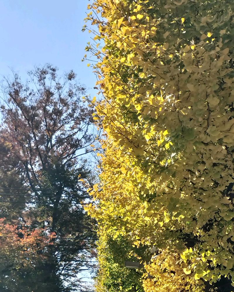 近くのイチョウ並木はかなり黄色い木とまだ緑の木があります