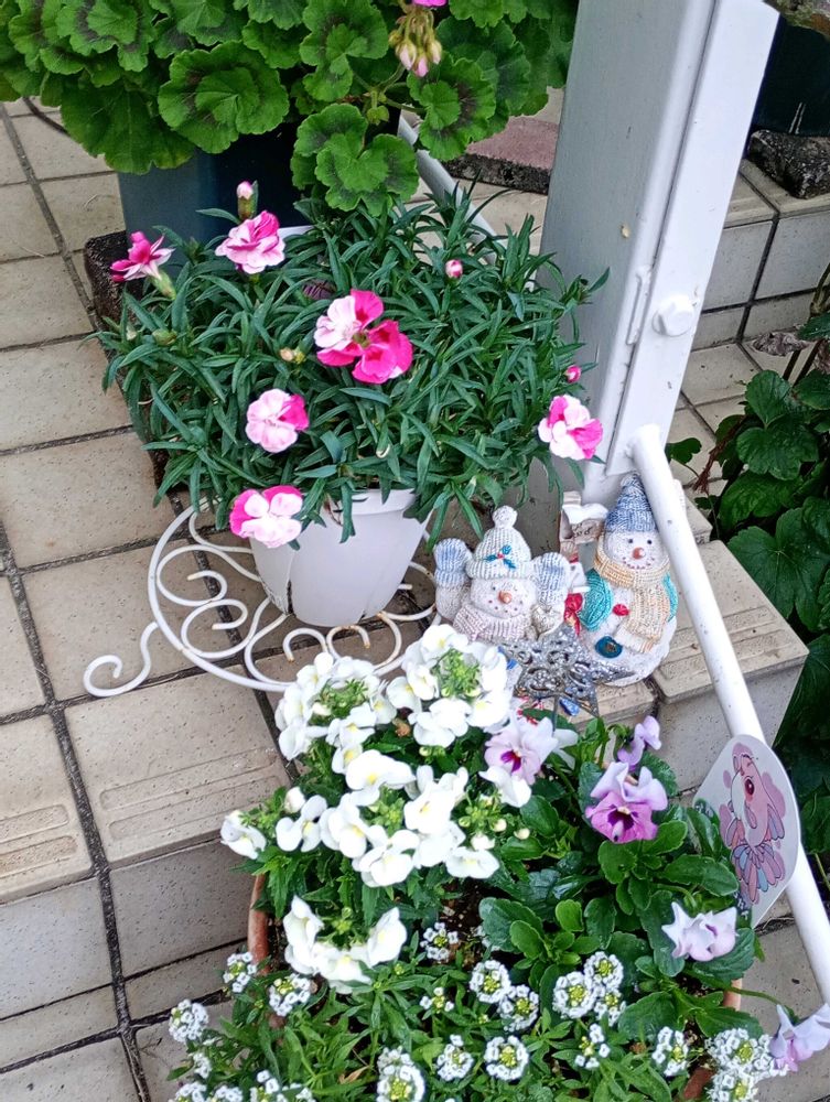 我が家の小花たち🥰ビオラの鉢に植えてあるアリッサムも勝手に寄せ植えに参加してくれました😂
