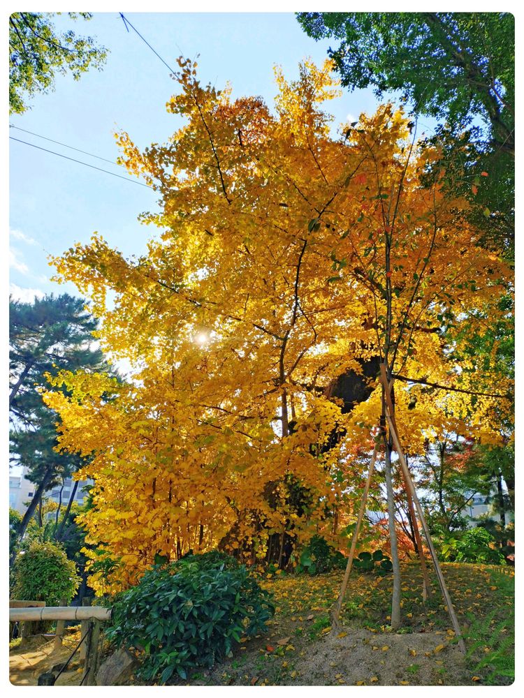原爆投下後の火災から生き残り 爆風で傾いた姿のままに 80年の時を耐えて今年も美しく黄葉しています。