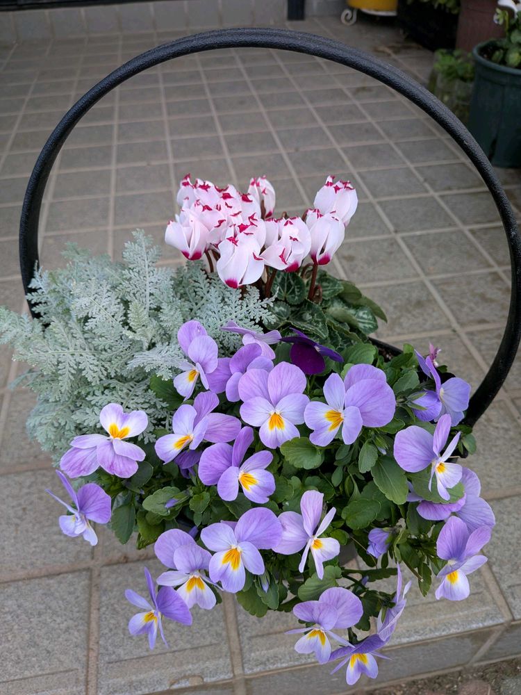 バスケットの寄せ植えにシルバーリーフとシクラメン、ビオラ素敵な寄せ植えになったね🪴