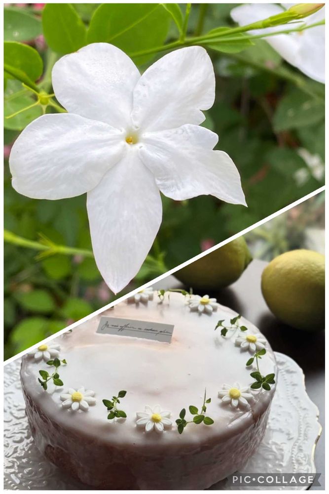 ☘️ジャスミン[ホワイトプリンセス]☘️....ひんやりとした風がお庭に吹くたびにユラユラと、真っ白な花びらが揺れています😍鉢からすっかり飛び出して大きなジャスミン集団になった今、香りまで素晴らしい👍💕✨下はある日見かけた白いレモンケーキ🍋。白いお皿がアイシングを引き立てていてなんて素敵。近頃過剰な生クリームが苦手になったあたしだけど、これなら珍しくひと切れ食べてみたくなりました〜☕️🫖😋✨