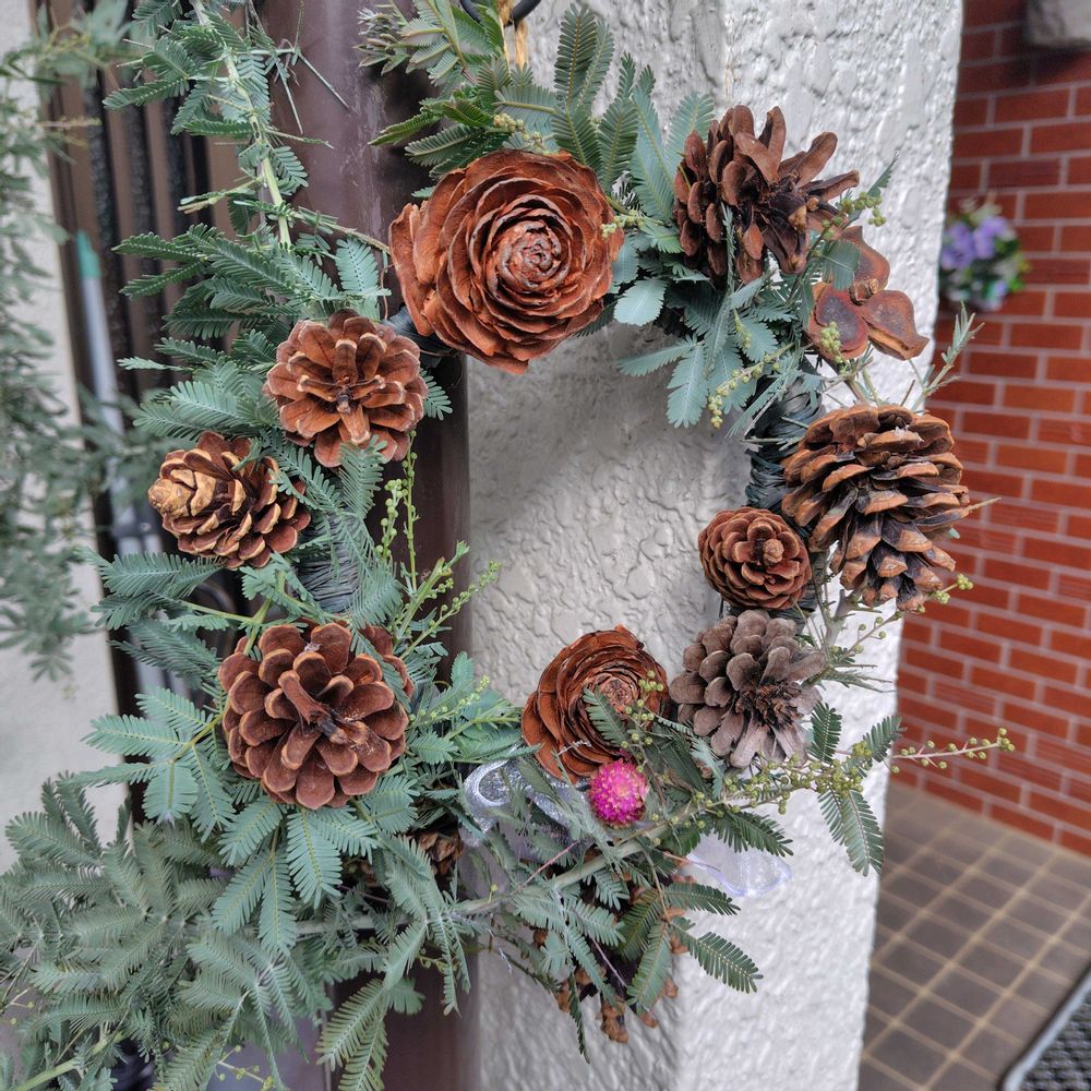 松ぼっくりとシダーローズのリースに玄関のミモザを絡めてみました。ミモザが初めて咲きそうですが、剪定がよくわからなくて、枝が暴れていまして、でも花芽がせっかく付いているので、なんとなくリースに巻きつけてみました。