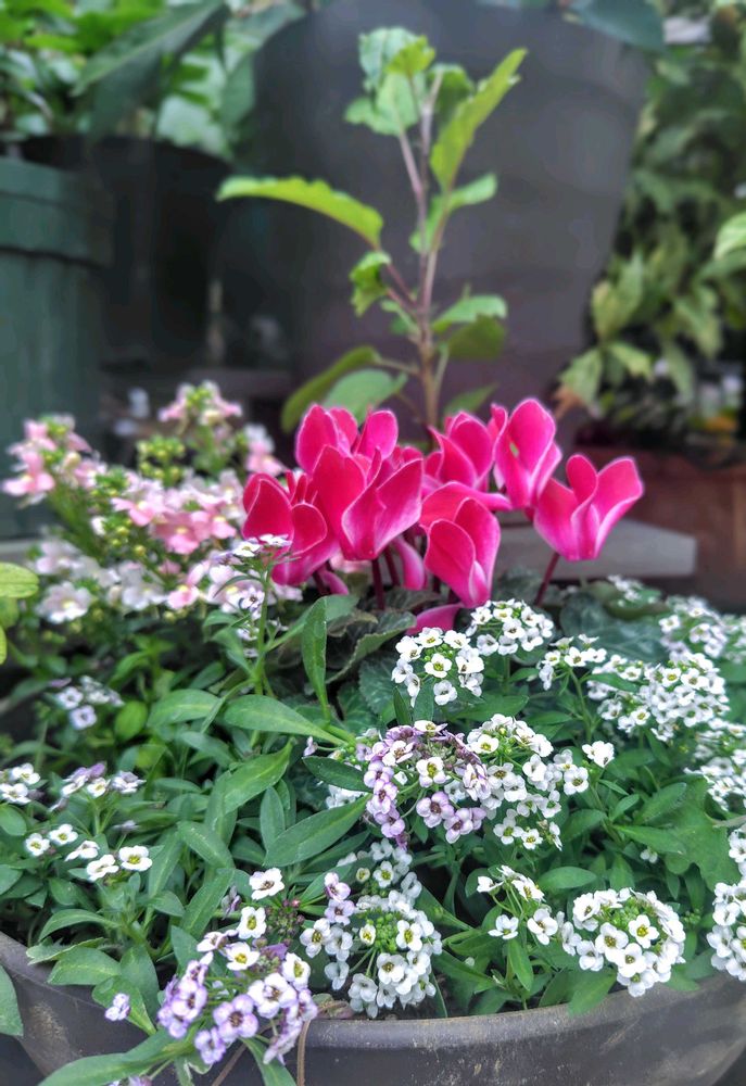 素敵な寄せ植えですね💕1枚目はアリッサムとシクラメン、ヒメリンゴですね。2枚目もビオラかな?優しい色合いと花姿も可愛いです💕