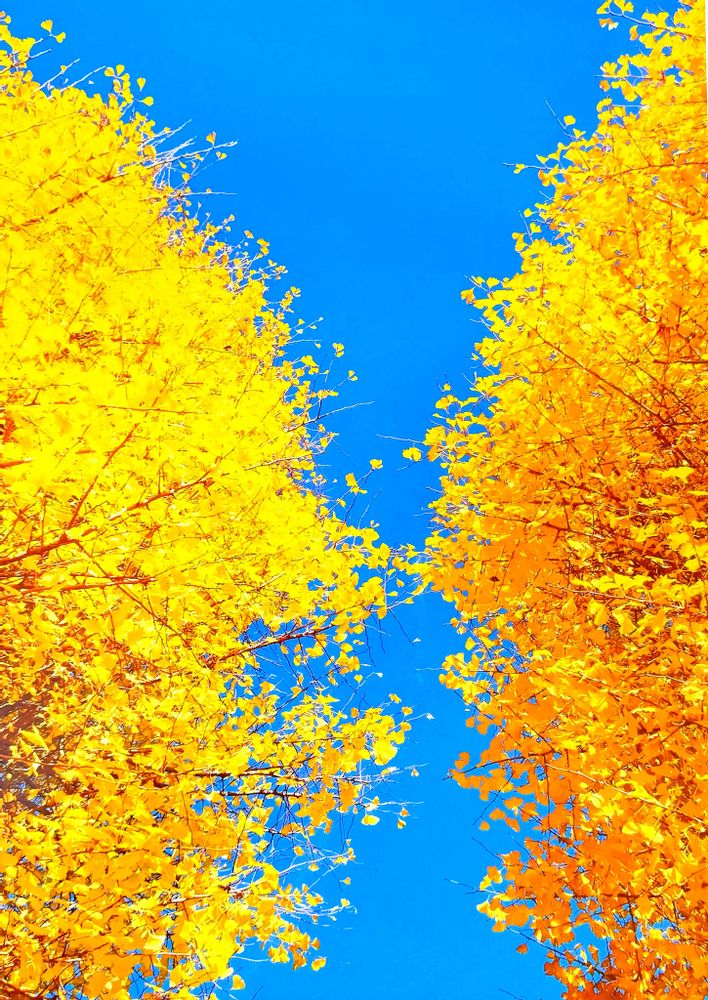 光り輝くイチョウの黄色と底抜けに眩しいスカイブルーのコントラスト。