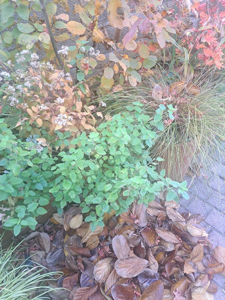 紅葉、スモークツリー、ユーパトリウム、チェリーセージ(まだ緑)、カレックスと、モクレンの落ち葉🍂