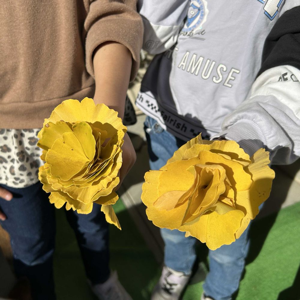 孫👧👧がイチョウの葉💛集めながらやって来ました♪