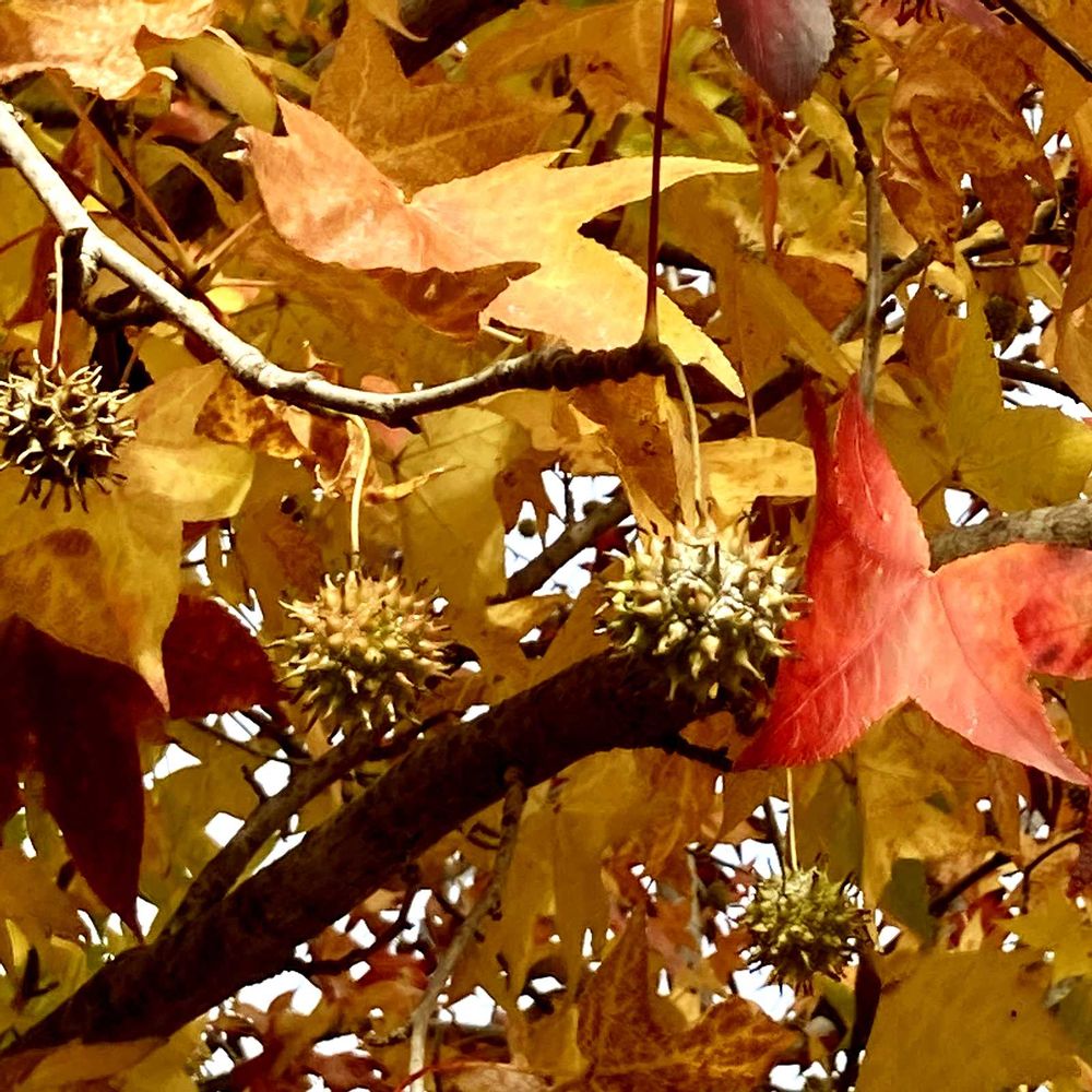 ジョギング中に潰れた実が落ちていたので見上げると、トゲトゲが新鮮な実がたくさんが連なっていた🍁クリスマスツリーのオーナメントみたいで可愛い❣️