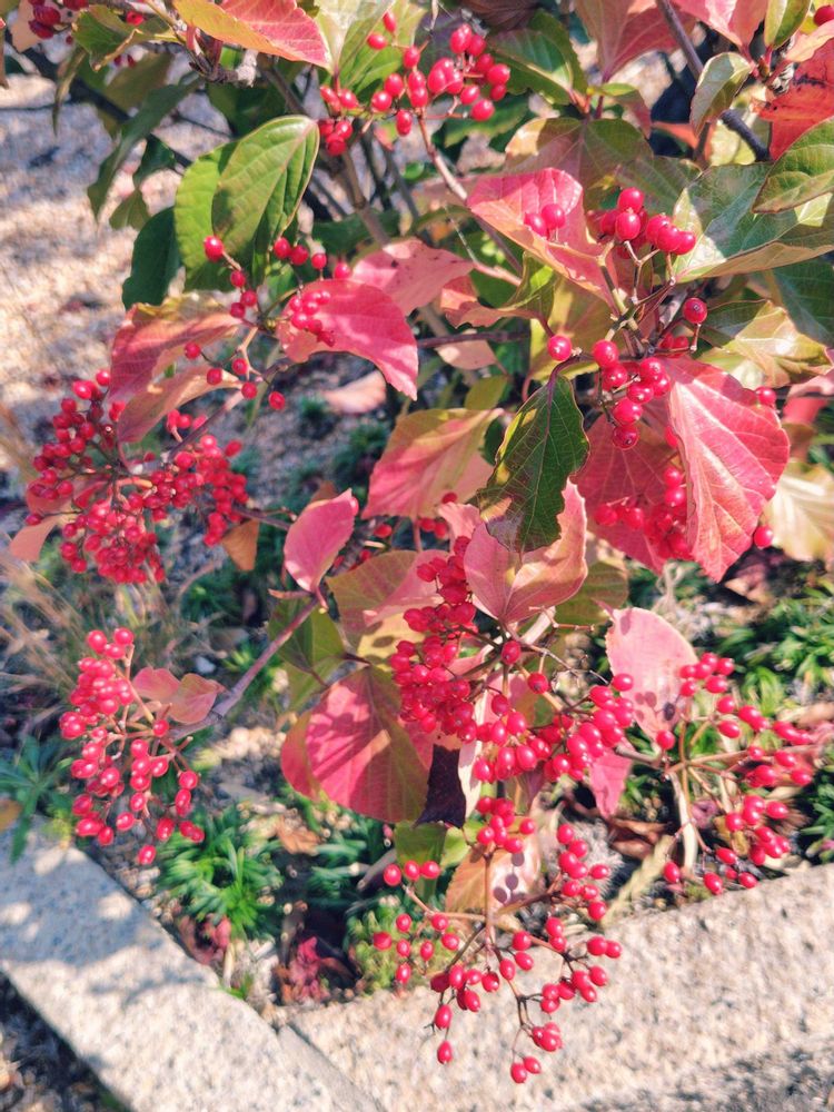 赤実に紅葉、可愛いですね、思わず📷しました。