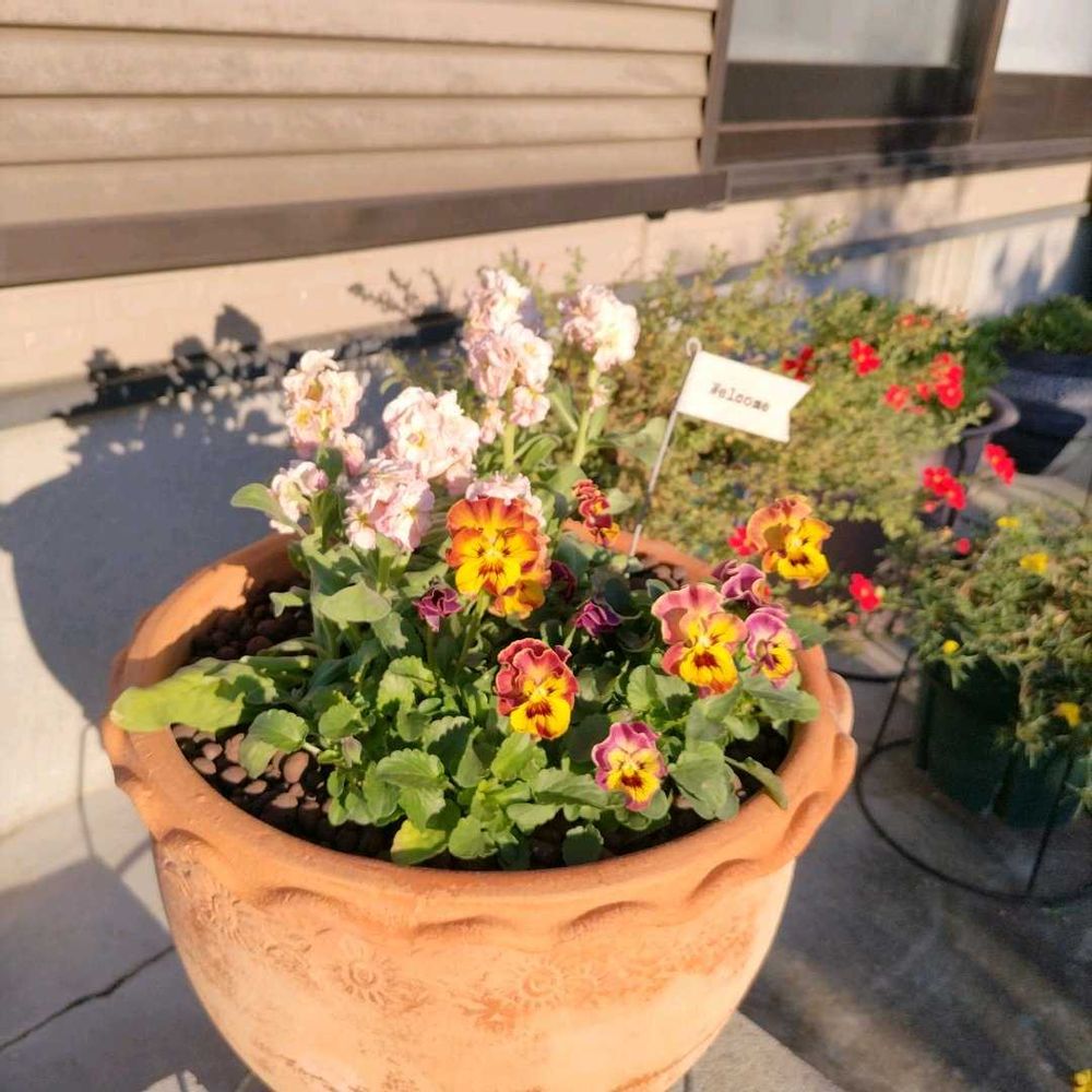 ビオラとストックのシンプルな寄せ植え作りました💁