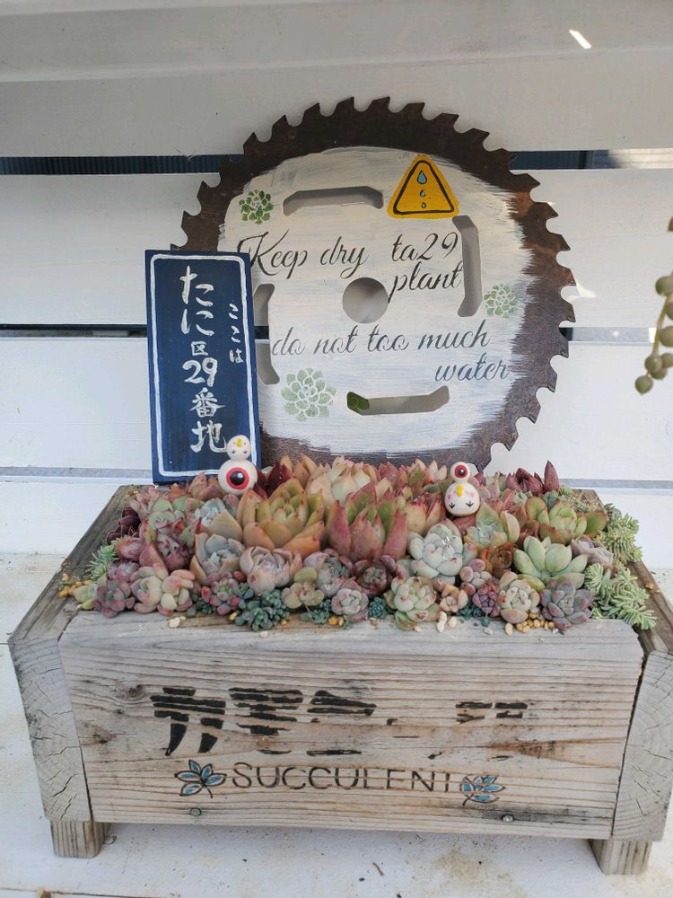 ①GS花友さんに頂いた木箱、お気に入りで玄関前に置いてたら多肉も木箱も日焼けしちゃったね😅寄せ植えを解体して植え直しました✨