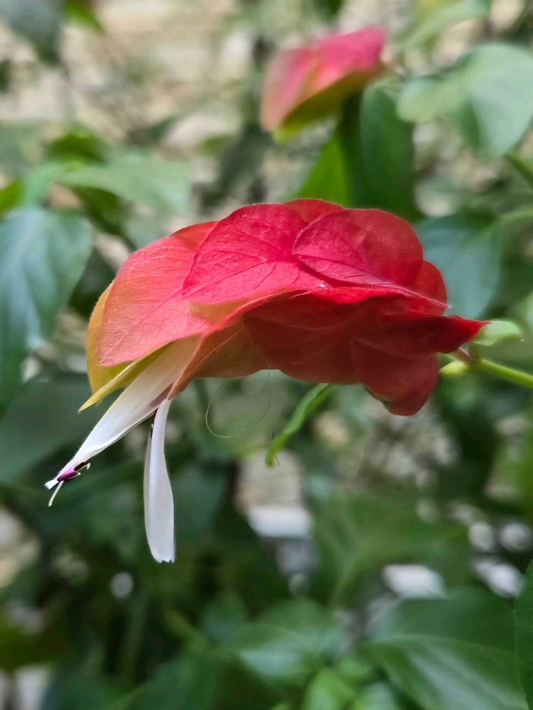 朱色の重なった苞(ほう)の形が、小海老の尻尾に似ているからです。小さな白い花は、苞の隙間から顔を出します。