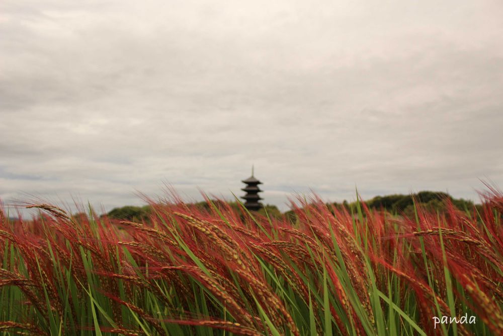 赤米の稲穂が風になびく遥かかなたに五重の塔が見えますね✨なんて落ち着く景色なんでしょう!