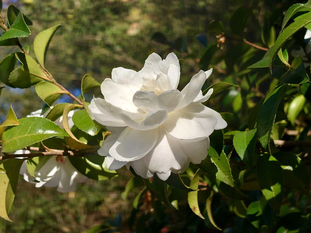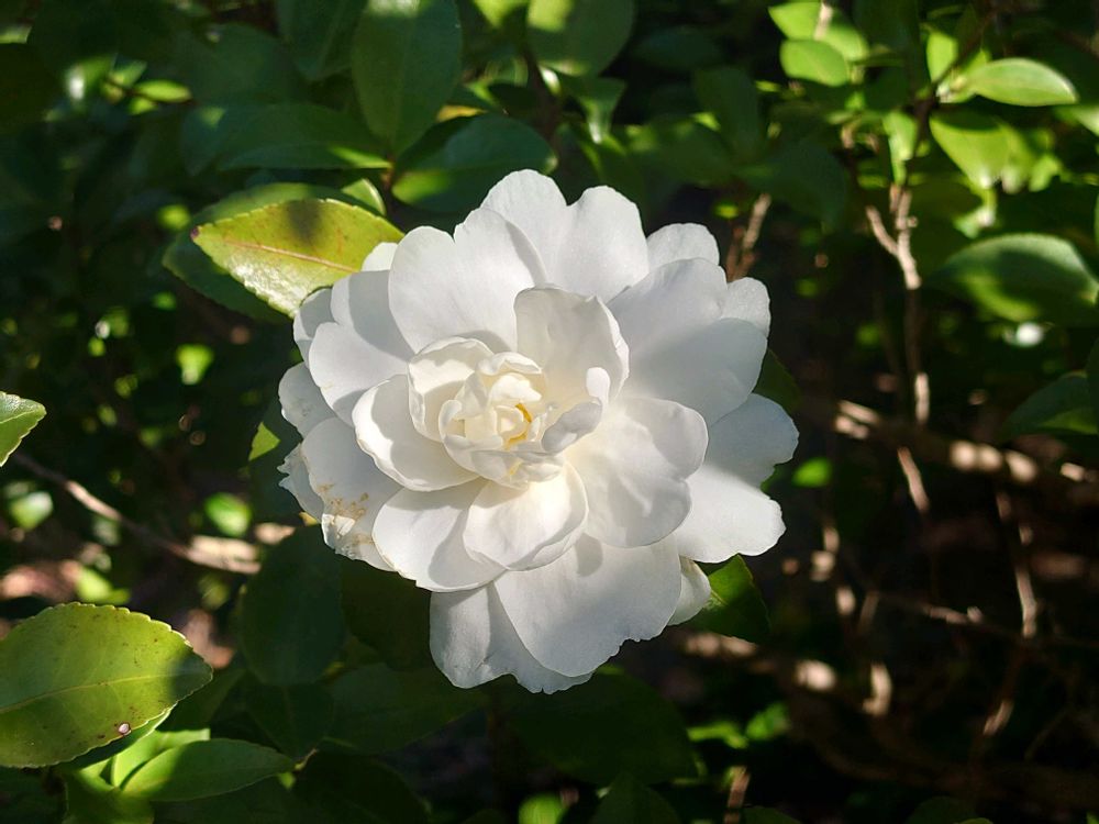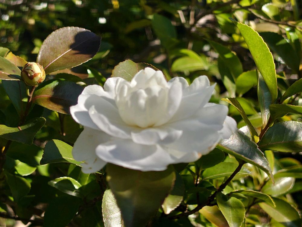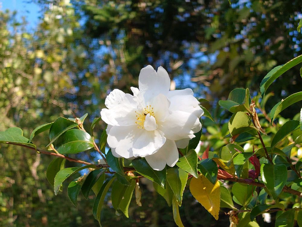 今日の午前、市内を散歩途中に見かけた山茶花。