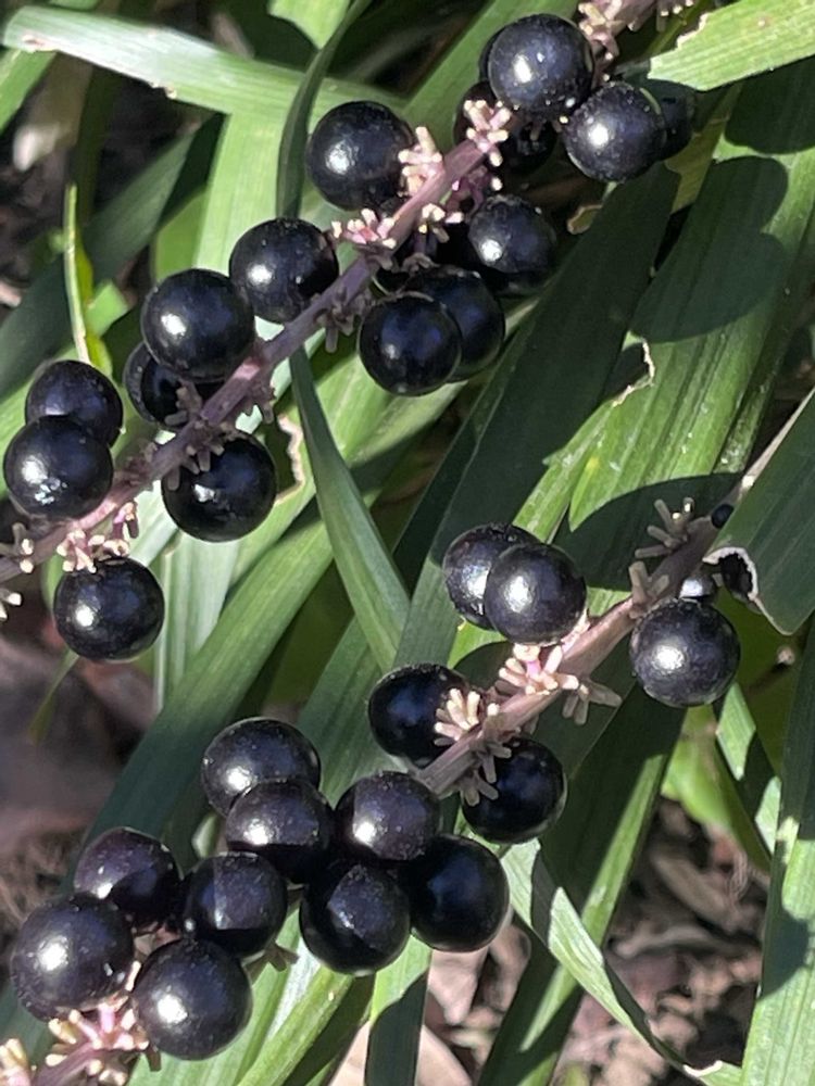 ヤブランの実がピカピカ✨キレイですね〜職場でも見ましたよ〜そのままにしておくと来年また増えますね♬