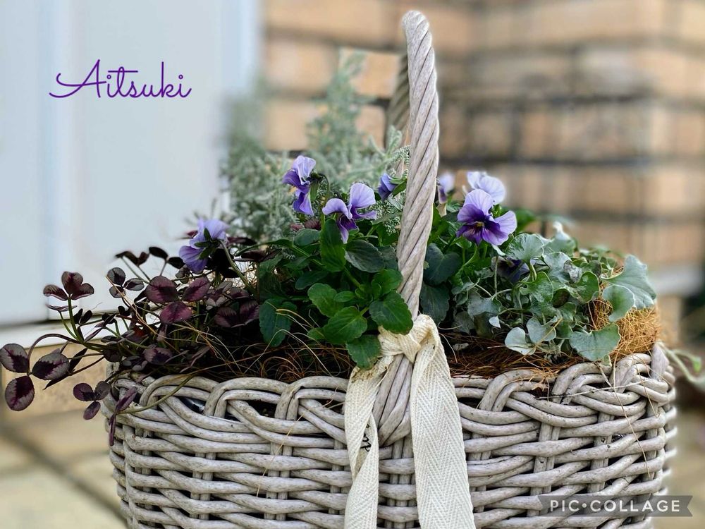 籠寄せと言うか先週のゆずの里祭りでアケビの蔓で編んだ籠がワンコインと格安だったのでそれに家に有ったビオラを🩵💜