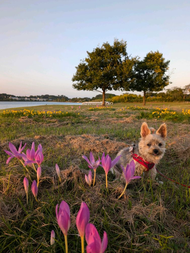 綺麗に咲いたイヌサフランを自慢しているみたい🤭