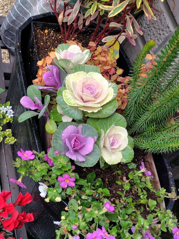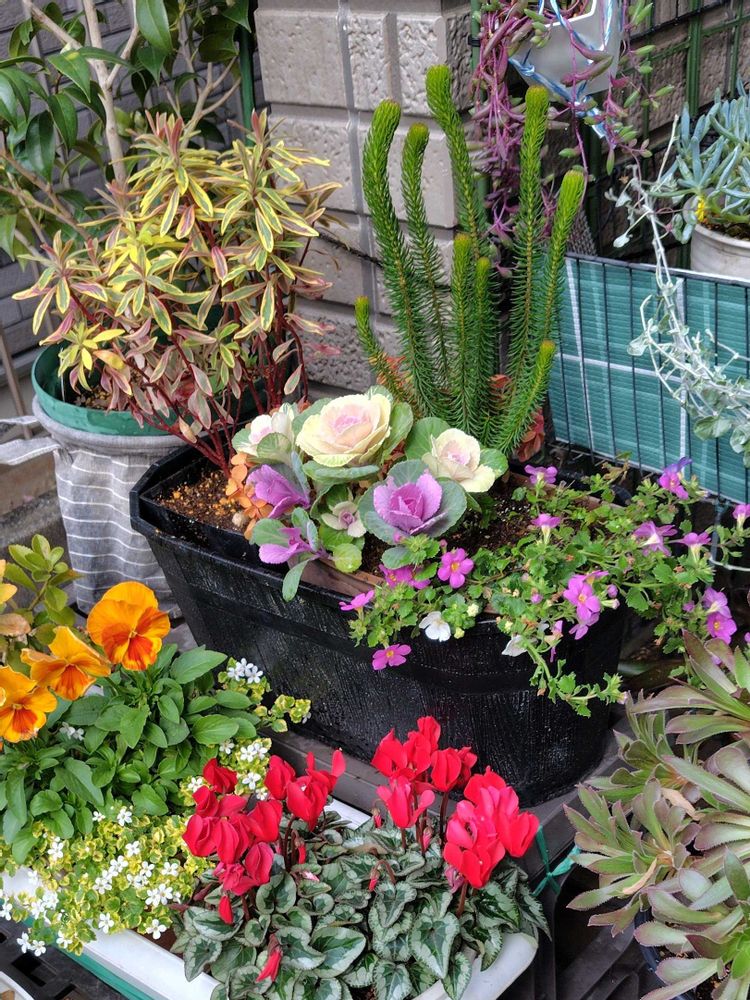 2鉢に分けて長鉢に。(葉牡丹、ゴールデンレインボー)