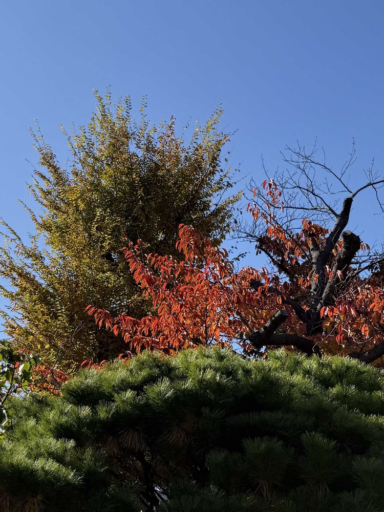 黄色の欅と紅色の桜🙂手前は松の木。この季節ならではの配色🍂