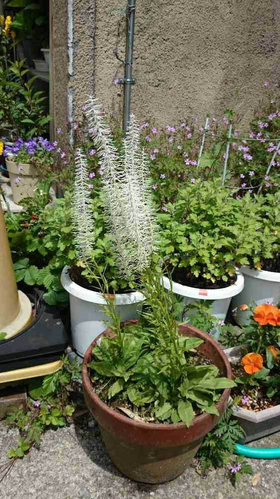 手前の白いお花です。6月に咲いているのを見かけました。宿根草っぽいんだけど…