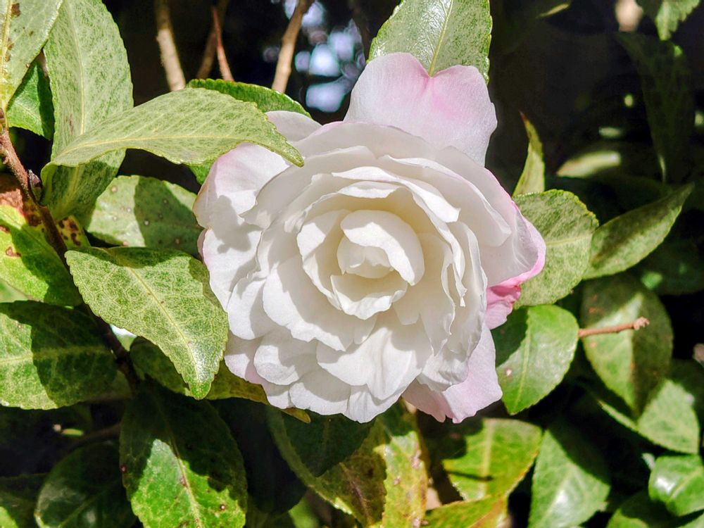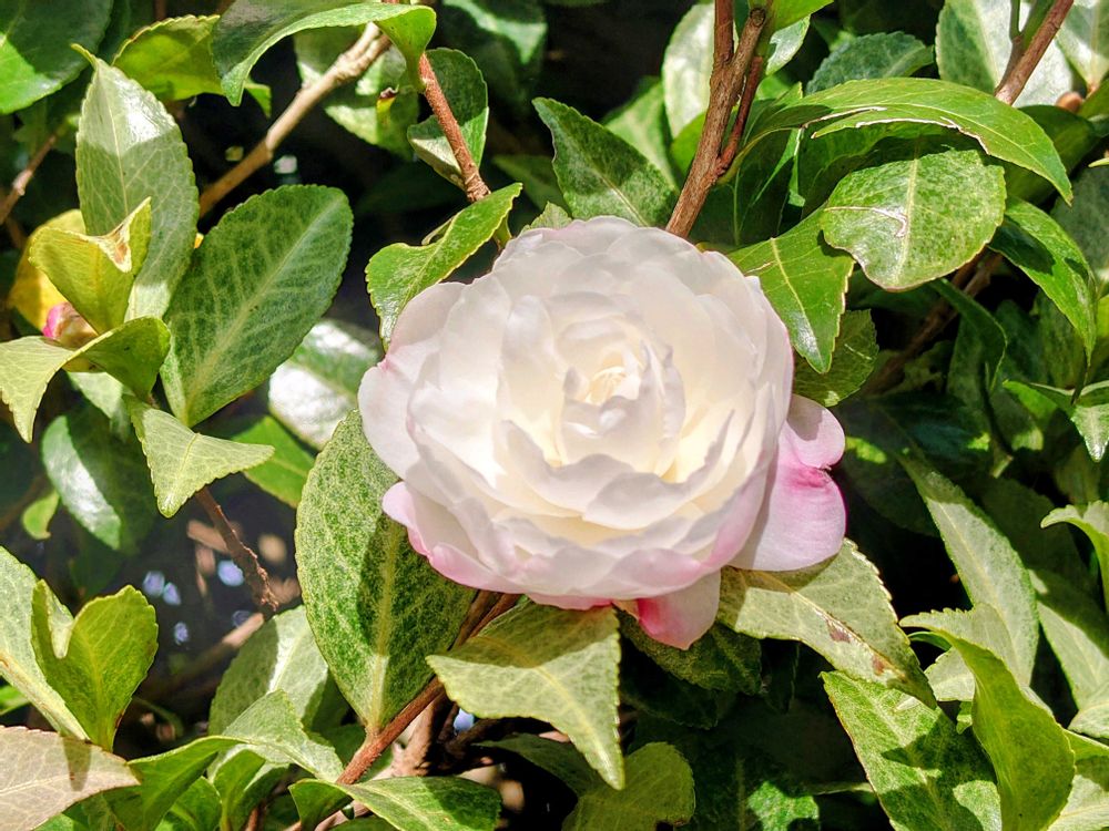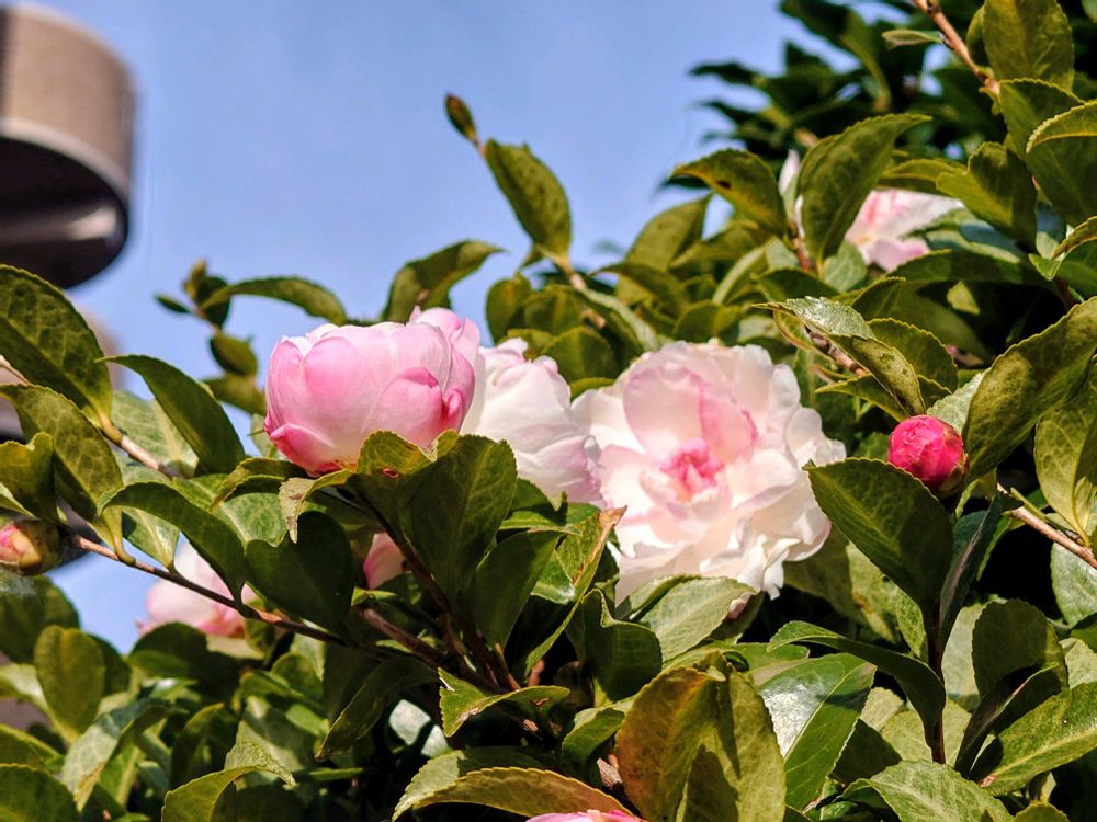 今日の午前、市内を散歩途中に見かけた山茶花。