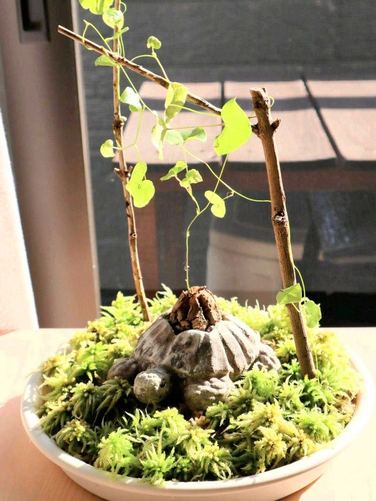 こういうのセンスないんですが私なりに好きなようにアレンジ💦庭の水苔と枯れ枝を持って来ました(笑) 亀甲竜は成長期は水好きらしいのでOKか!?