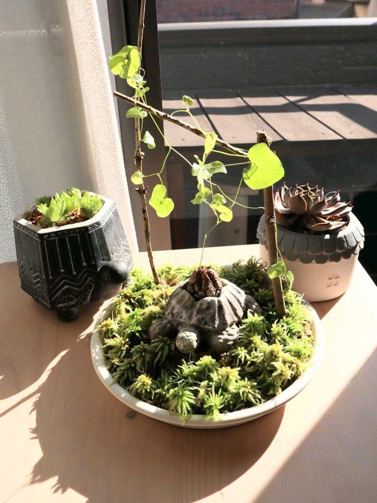 多肉や塊根等は全く分からないので、日陰庭からの避難も兼ねての水苔アレンジ♪セオリー知らないから笑われないか心配でした💦