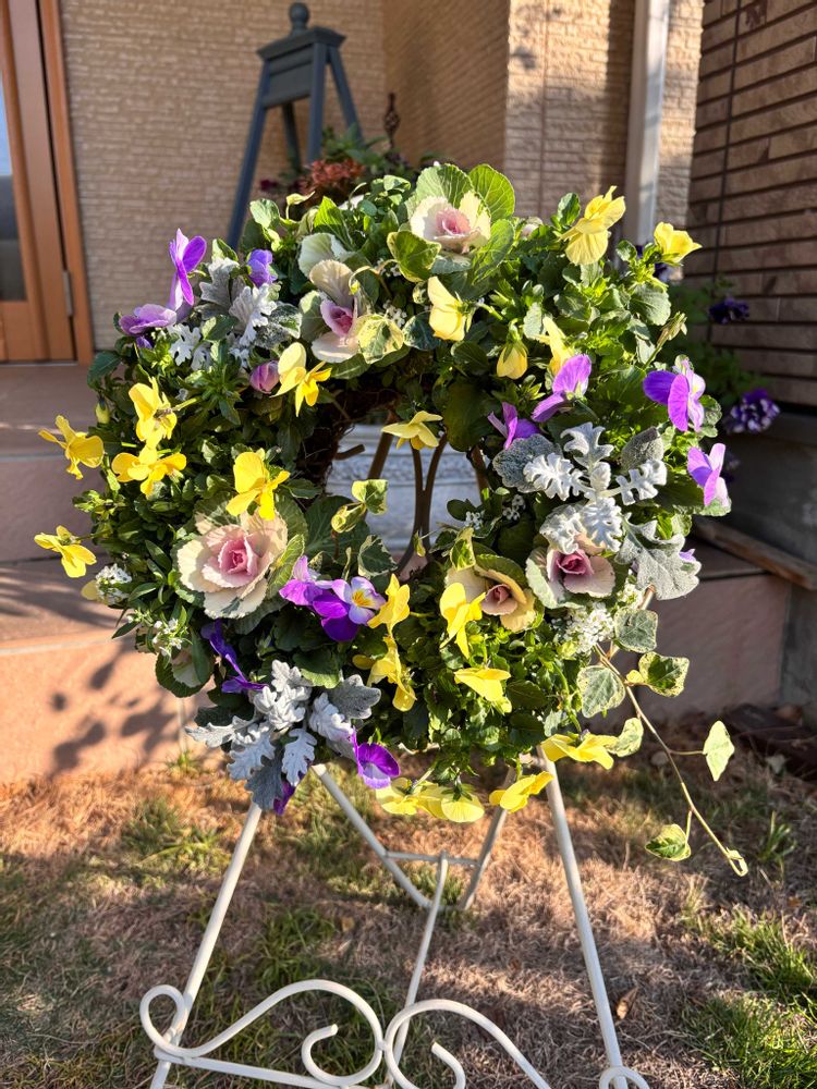 ①今年最初のビオラのリース。今年はハボタンも早く出回っています。普段はあまり選ばない明るい黄色を入れました☺️