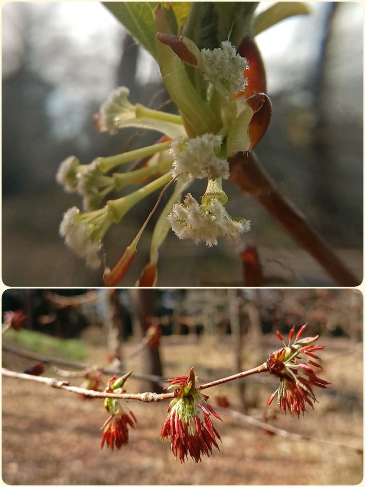 葉の展開より早く開花する。花には花弁も萼もない。淡緑~暗紅色の雄しべの葯が多数垂れ下がり、雌しべは短く、雄しべの花糸の基部に隠れて目立たない。果実は長い柄のある扁平な翼果、房状に垂れ下がる。