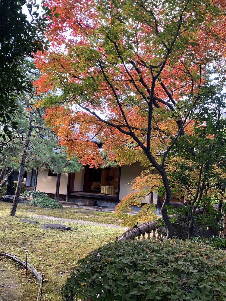邸内なはアカマツなど多くの樹木や居間に面した一帯を一面スギゴケを植えて水路を配した回遊式日本庭園。